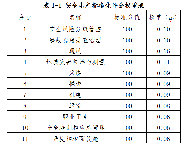 第十八條 煤礦安全生產(chǎn)標(biāo)準(zhǔn)化考核滿分為100分,采用各部分得分乘以權(quán)重的方式計(jì)算,各部分的權(quán)重見(jiàn)表1-1。